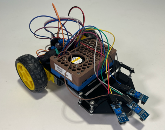 The goal for this project was to create a line-following robot using IR sensors. The chassis for the robot was designed in Onshape, and the code was written in python on a raspberry pi. We used an array of three IR sensors to determine whether we were on the line or if we needed to turn. If only the middle sensor detected the line then we assumed that we were on the line. If the other two sensors picked up a line then we made decisions about how to turn based on the data we were collecting.