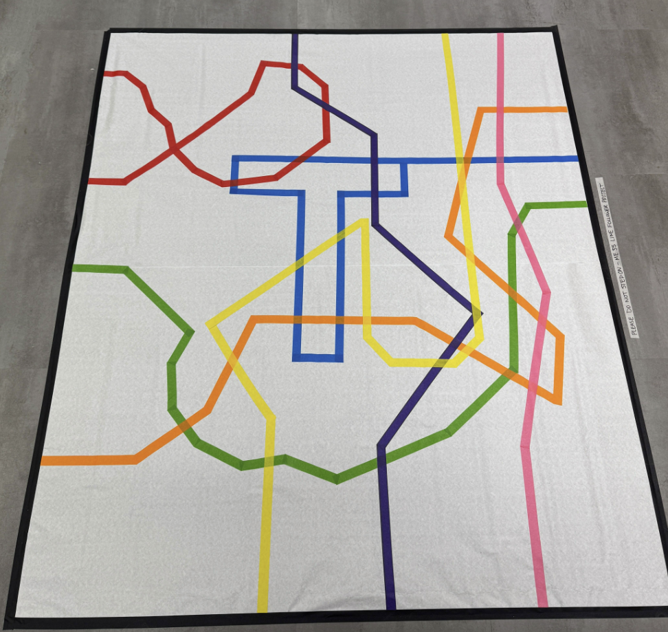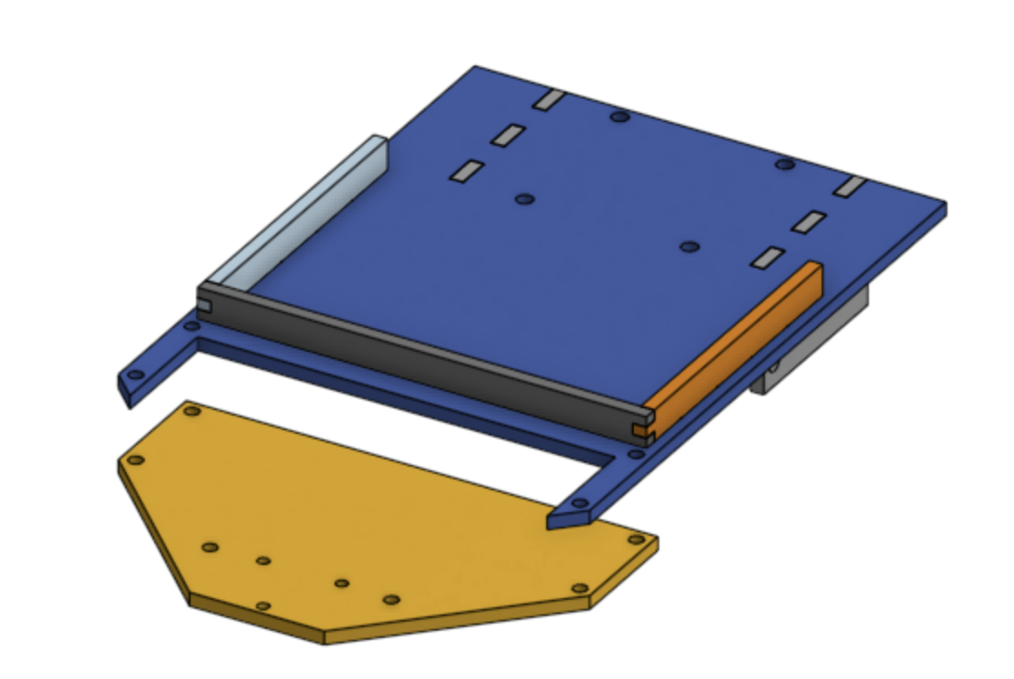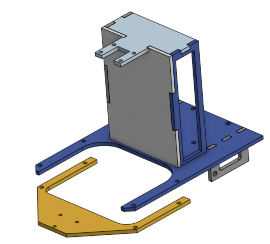 The goal for this project was to use a RaspberryPi camera to identify and follow a colored line from the mat pictured left. The design for the robot was done in Onshape (bottom left). The pieces pictured were lasercut with tight enough tolerances that the joints stayed together without other adhesives. The bottom and top pieces were connected by 4 bolts with 3 locknuts each keeping everything in place. The large gap in the center is the window that the camera sees through.