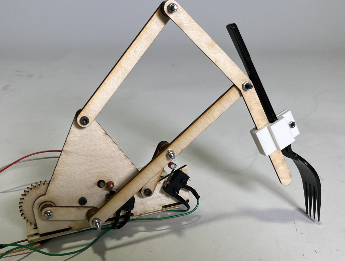 I designed the mechanism in Onshape (top right) and then laser-cut the pieces using screws with locknuts as the axels for each joint. There are also a few gears on the back to slow down the motor and increase the torque applied by the fork.