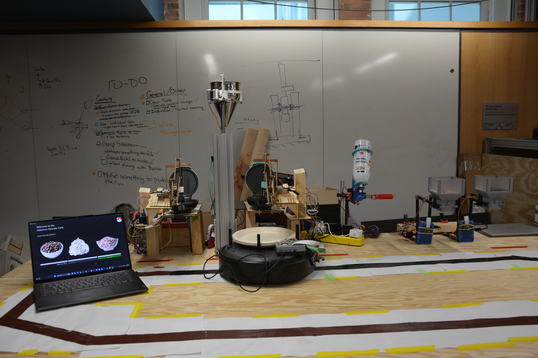 I did also work on the code for the fork and full table mechanisms, which both operated fairly similarly. Since everything had to be autonomous, we used an API though Airtable to communicate the status of each station between groups. I worked out the logic for the two cooking stations which ended up being as follows: the batter is dispensed when the roomba arrives at the first station. Both griddles close, cook, then open. The first table raises, the fork extends and retracts to remove the pancake, then the table lowers and the roomba moves on. Once the roomba reaches the second station, the table raises, the fork moves, and then the table is lowered. I also developed the full protocol for communication between all of the teams.