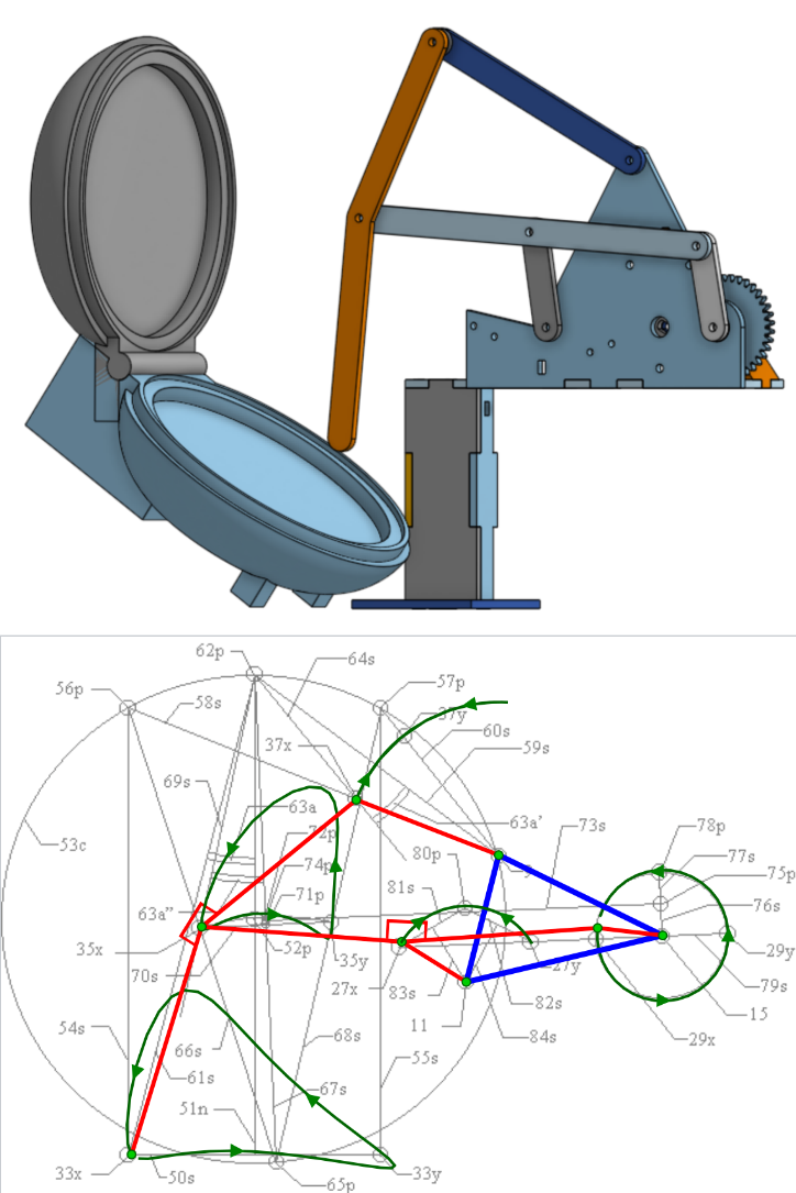 My idea for the mechanism was inspired by a Klann linkage (diagram pictured bottom right). The linkage is designed for walking robots, but I thought the shape of the movement at the bottom (green lines) could work well to remove the pancake. The initial idea was to run the mechanism backwards and use the upwards and forwards motion to flip the pancake out of the griddle.